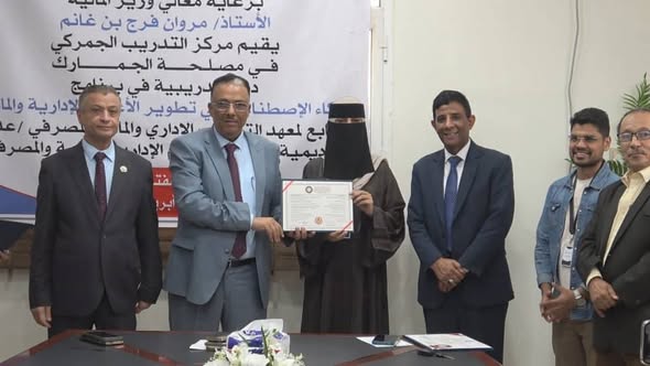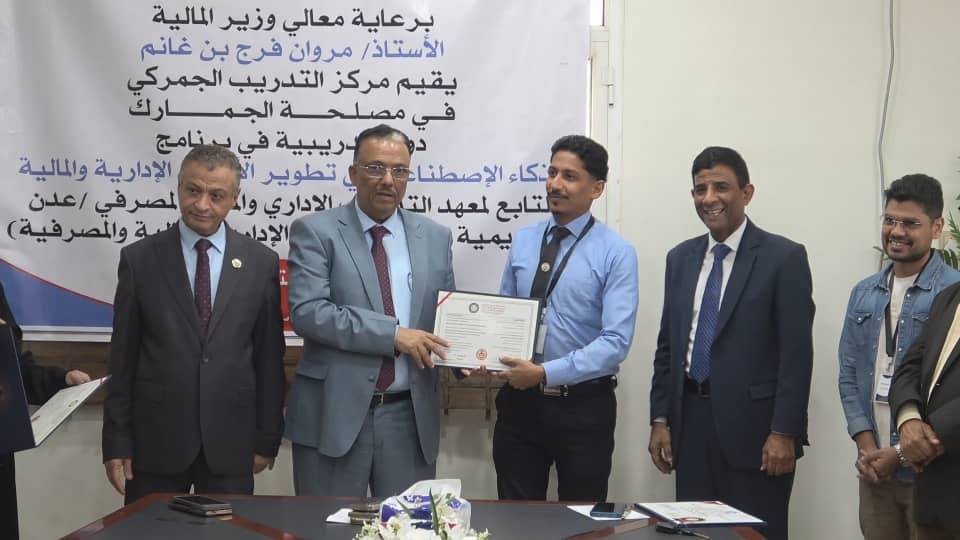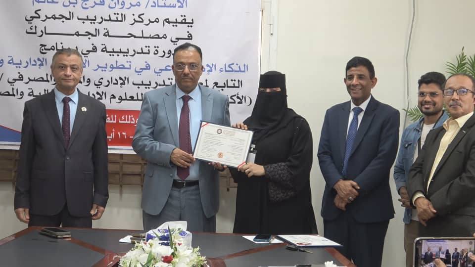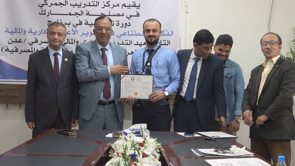 وفي ختام الدورة قام رئيس مصلحة الجمارك الأستاذ عبدالحكيم القباطي، بتوزيع شهادات المشاركة على المتدربين، معبراً عن تقديره لالتزامهم وجهودهم خلال فترة الدورة.